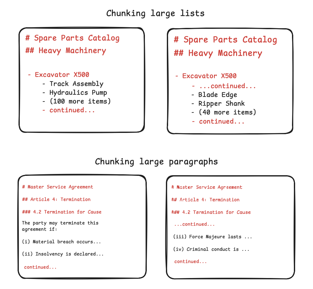 You use visual cues to chunk at boundaries of tables, lists, paragraphs and retain a reference to parent context, so that the LLM connects and make sense of all the chunks when retrieving them.