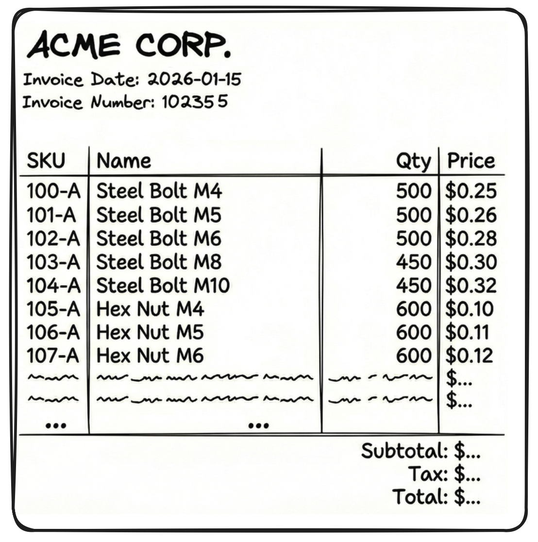 { "SKU": "104-A", "Name": "Steel Bolt", "Qty": 500, "Price": 0.25 },