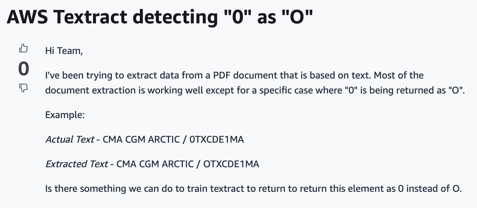 Textract reads characters, but it cannot reason if an ambiguous circular character is the letter "O" or the number "0".