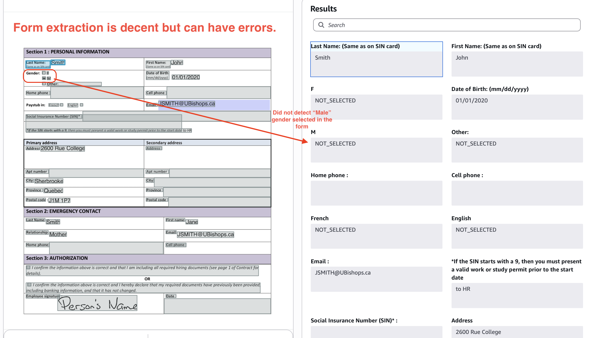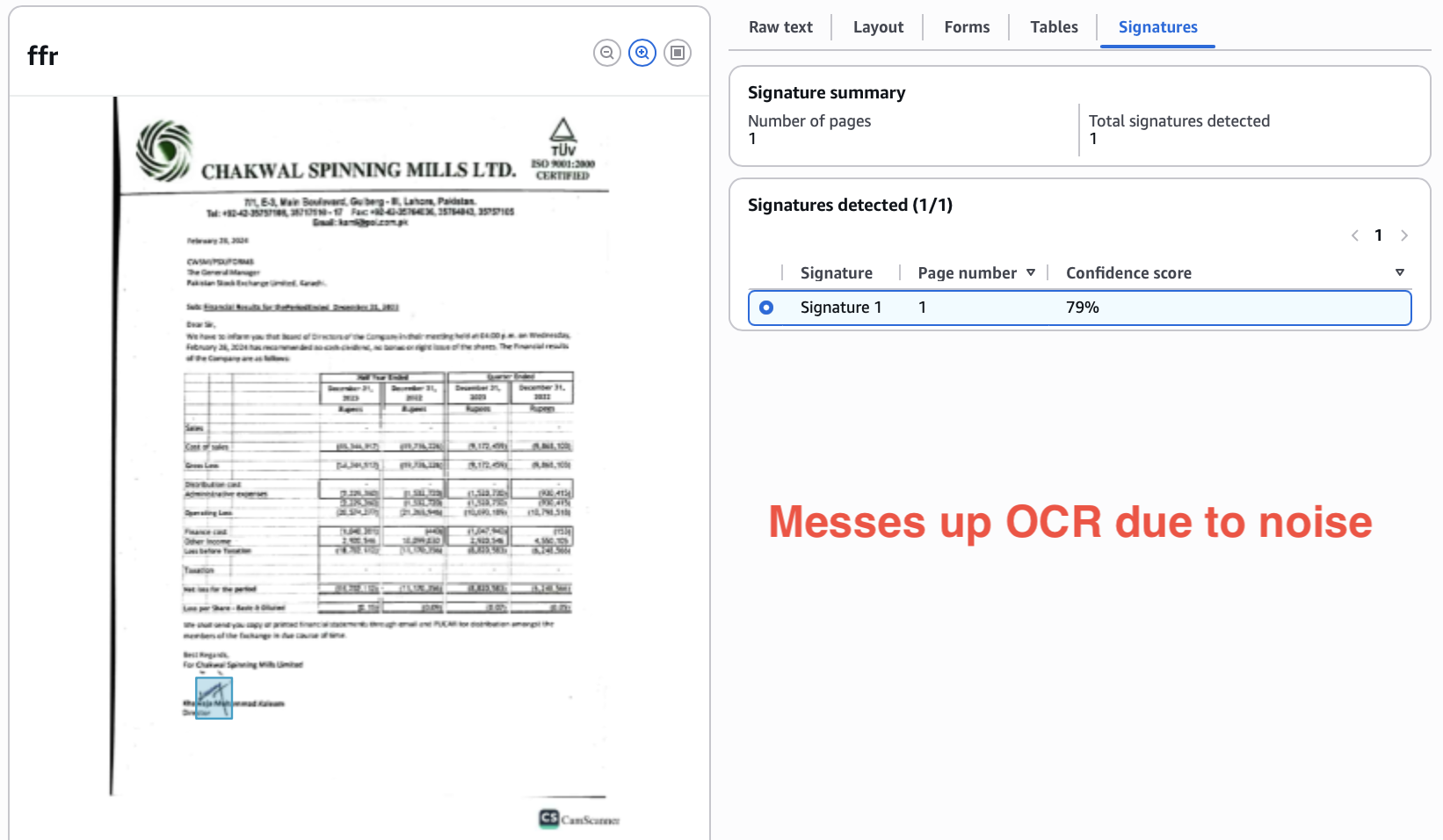 In another example, Textract gets the OCR wrong (hallucinates “in” in-between name) because the signature overlaps the text, adding noise.
