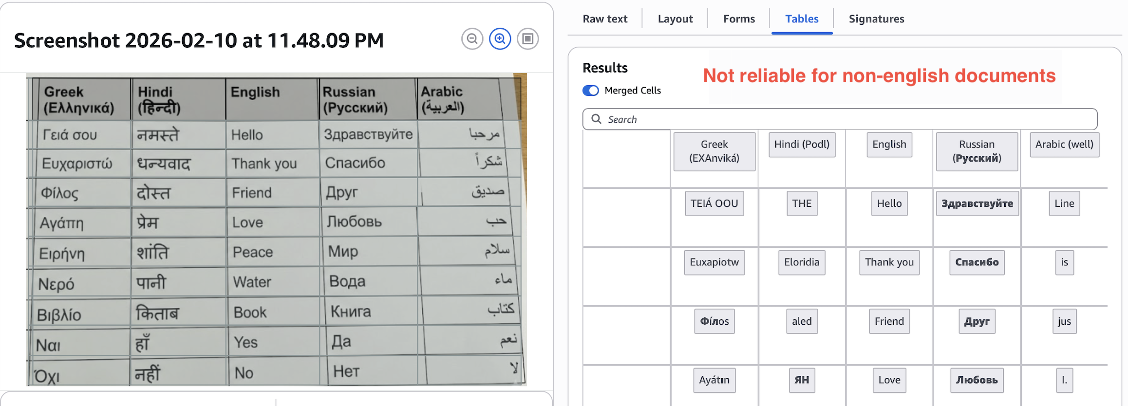 Textract extracts English well, does okay with Russian, Spanish, German, few more, and fails for others.