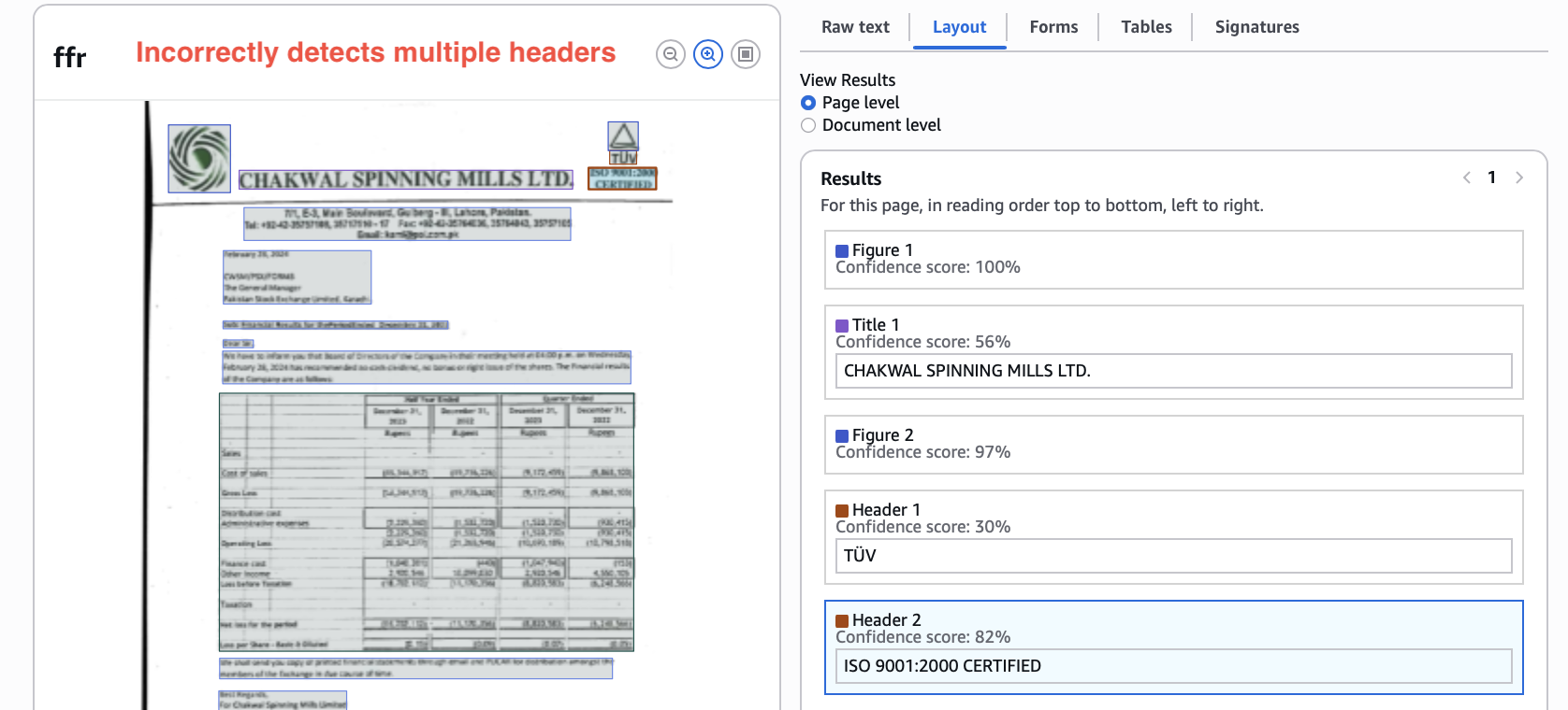 There are many other small error occurrences which add up, like here Textract gives two separate headers which should be one.
