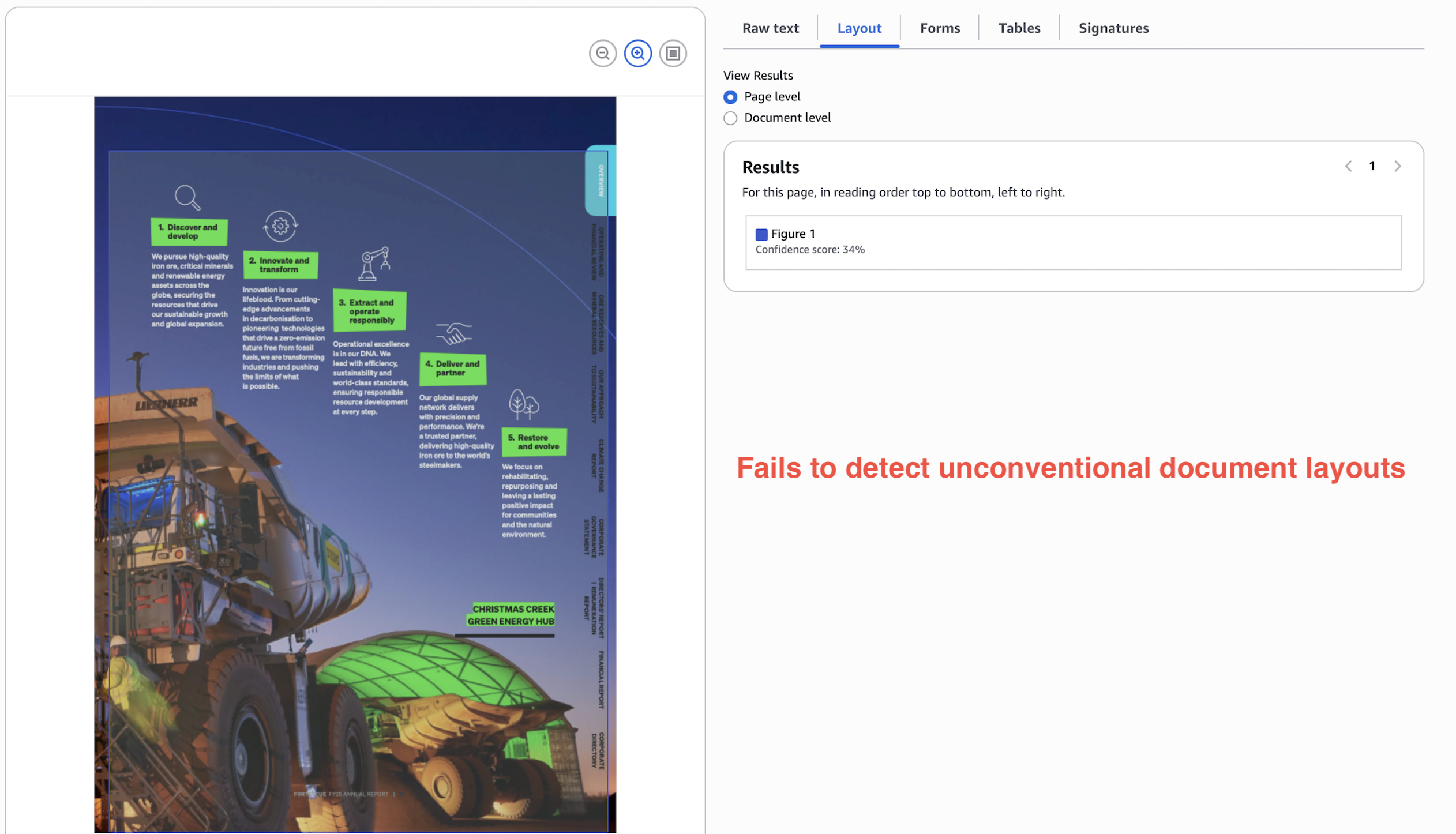 In a stress test, non-trivial document layouts can fail spectacularly on Textract. In the below example, Textract just gives up and extracts the whole page as an image.