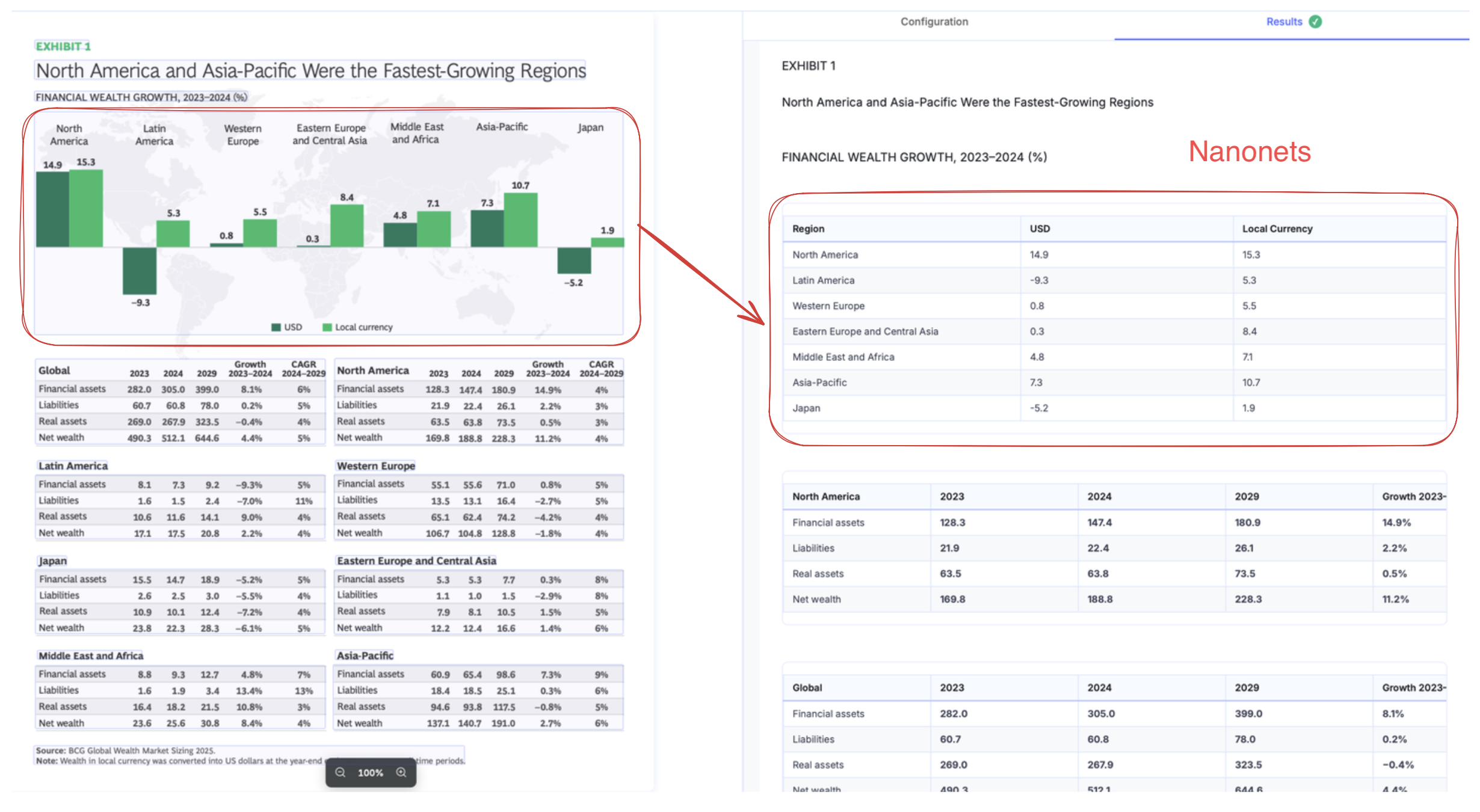 Nanonets output extracts these cleanly as separate tables.