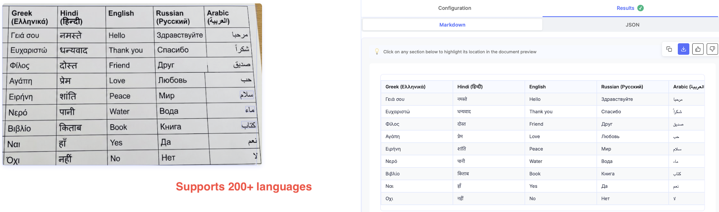 Most LLM-based APIs detect and extract documents in 200+ languages.