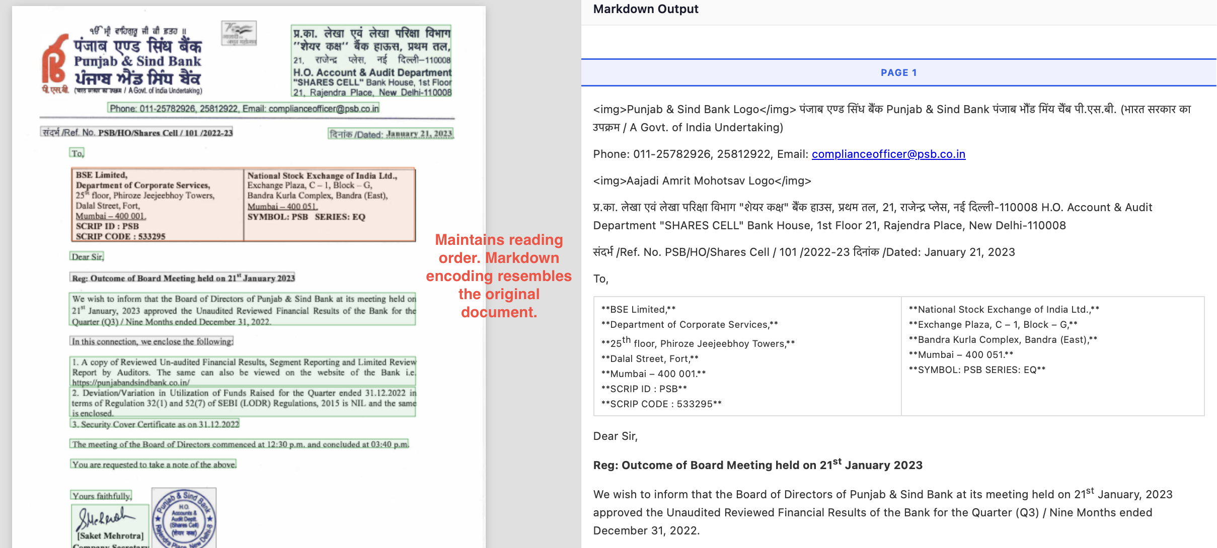In constant, Nanonets preserves both the visual layout and reading order well, in markdown blocks.