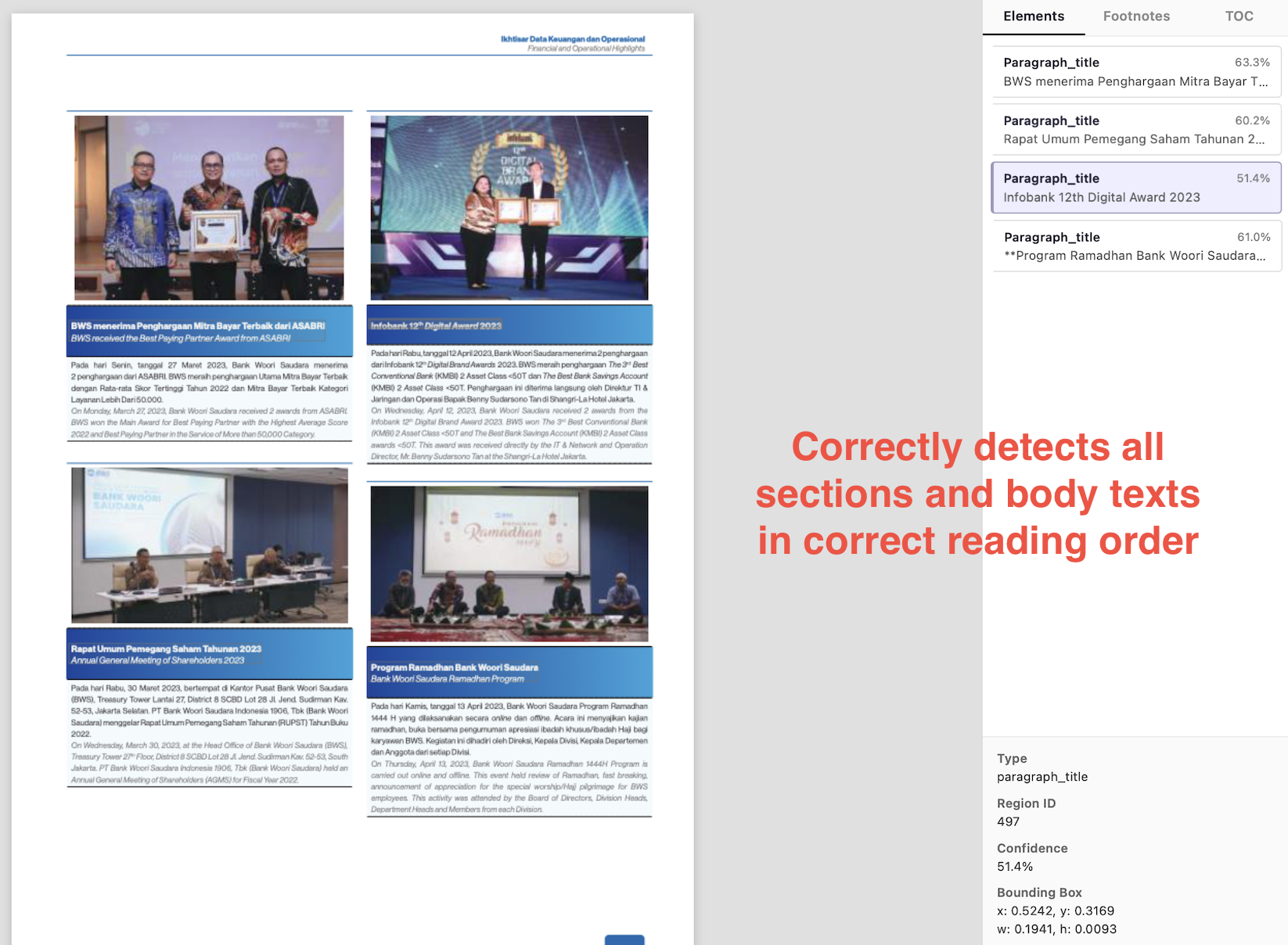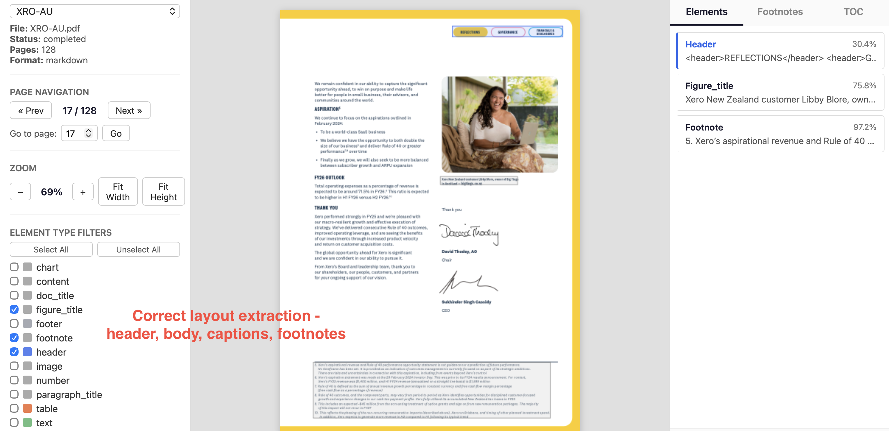 Nanonets extracts footnotes correctly, extracts caption as figure_title to create relation with image, and extracts headers correctly.