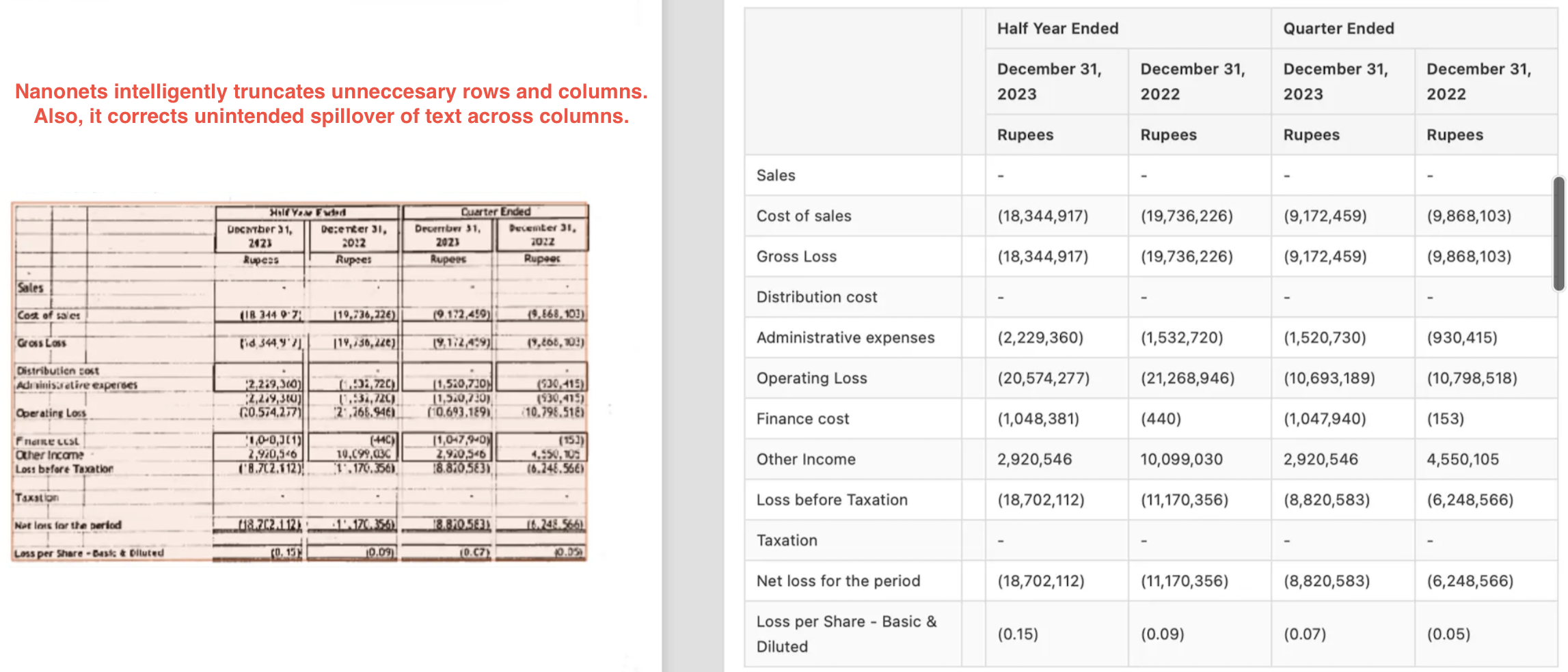Nanonets gives a much better output here, with intelligent truncation of rows and correction in unintended spillover of columns.