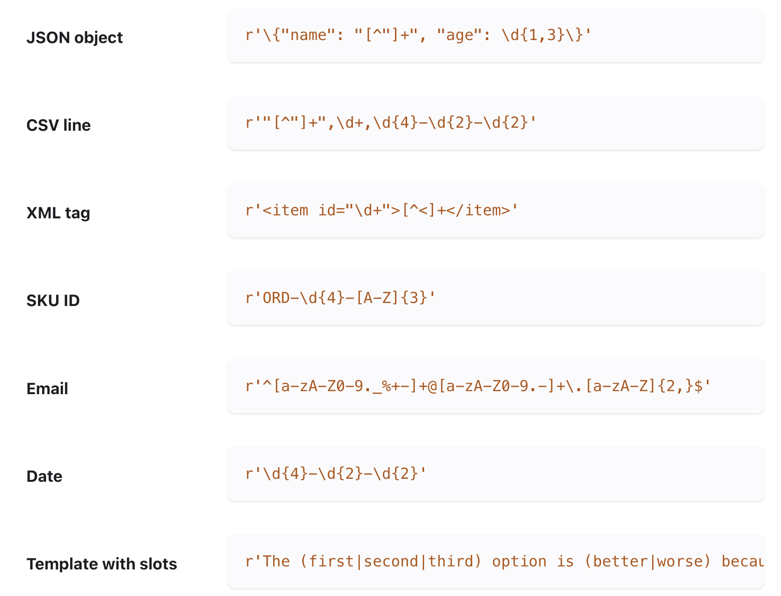 For finer control, our API also supports setting up exact regex / grammars for specific values in the output using constrained decoding.