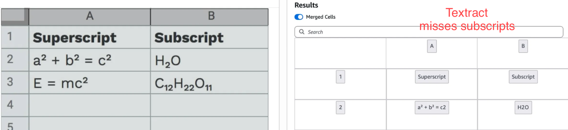 Textract also isn’t tuned well to read superscript and subscript.