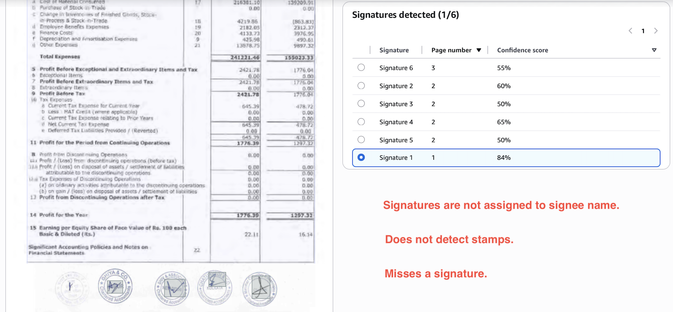 Consider the below output. It misses one signature, doesn't detect the stamps, and the 4/5 signatures detected are not linked to signees and not present in the layout portion of the output.