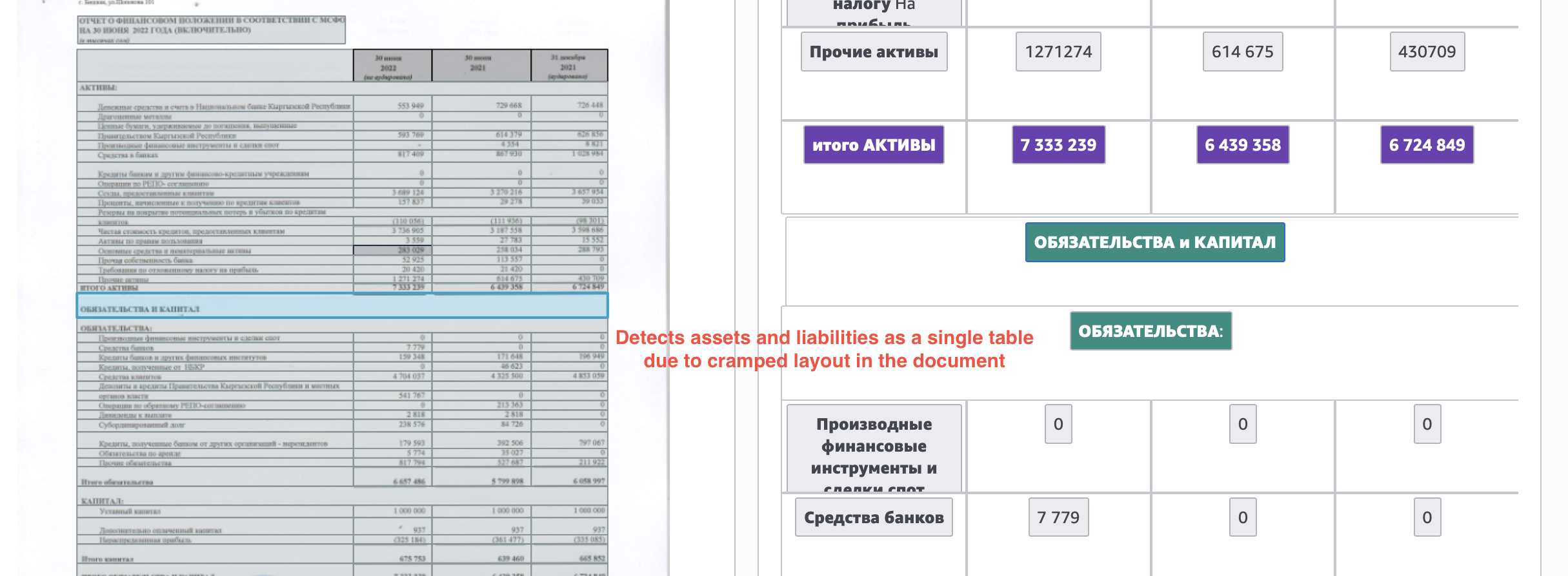 Here's one more example, where Textract output combines the assets and liabilities tables, only separating them as “different sections in the same table”.