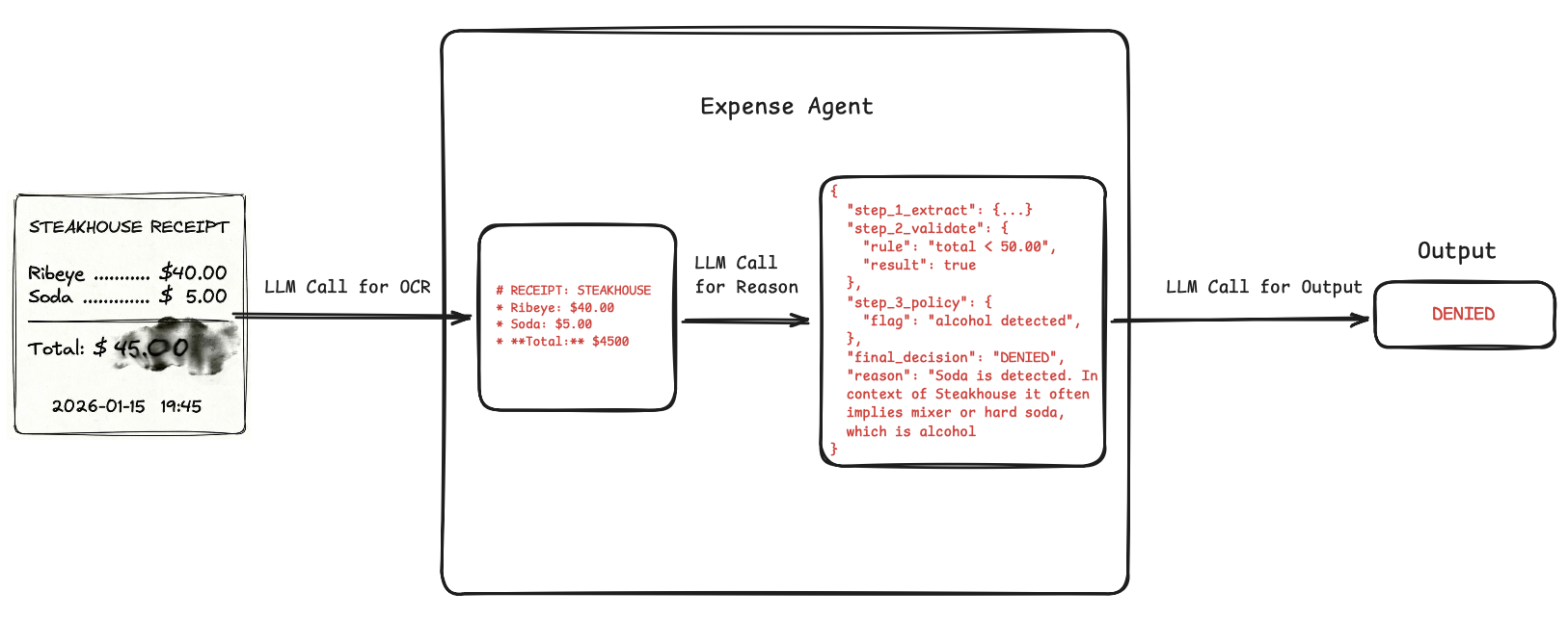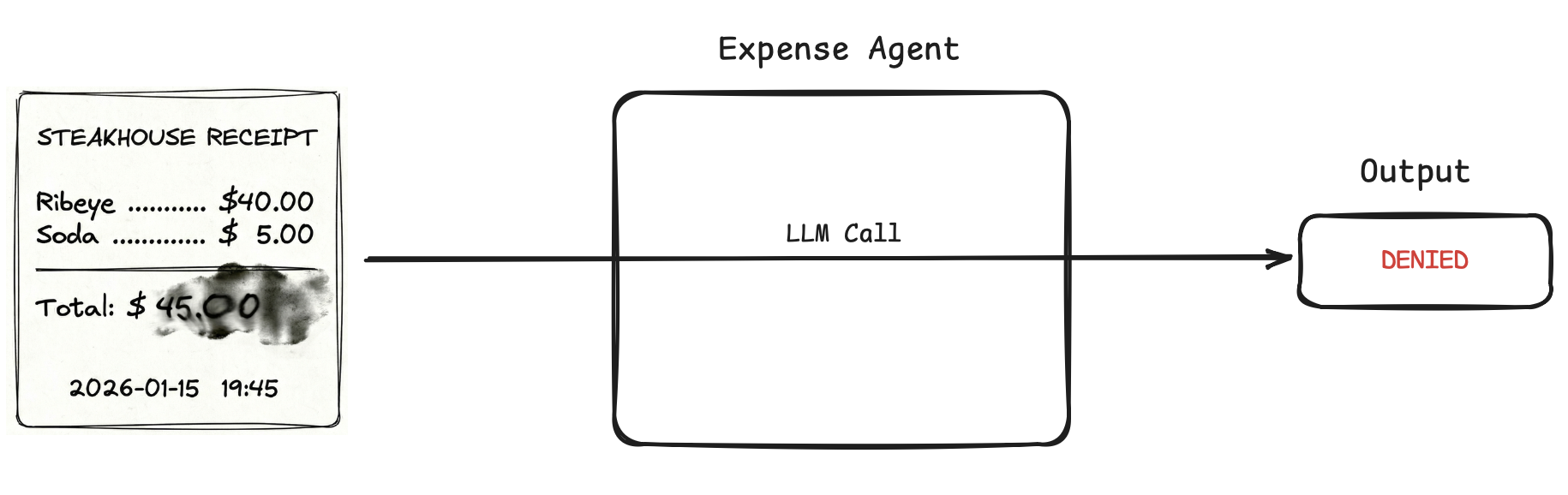 Say we have an expense approval agent. We add a rule to auto-approve any meal expense under $50. User uploads a scanned receipt for a steak dinner that cost $45, and the agent returns "Denied".