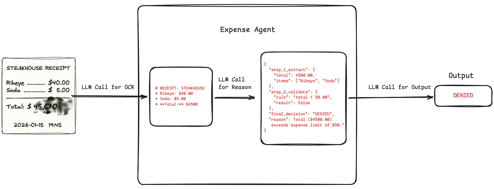 We have no audit trail: Did the OCR part hallucinate extra zeroes and read $4500? Did it read the currency symbol $ as a 4? Did it fail at math and think 45 > 50? Did the reciept invoke a flag?
