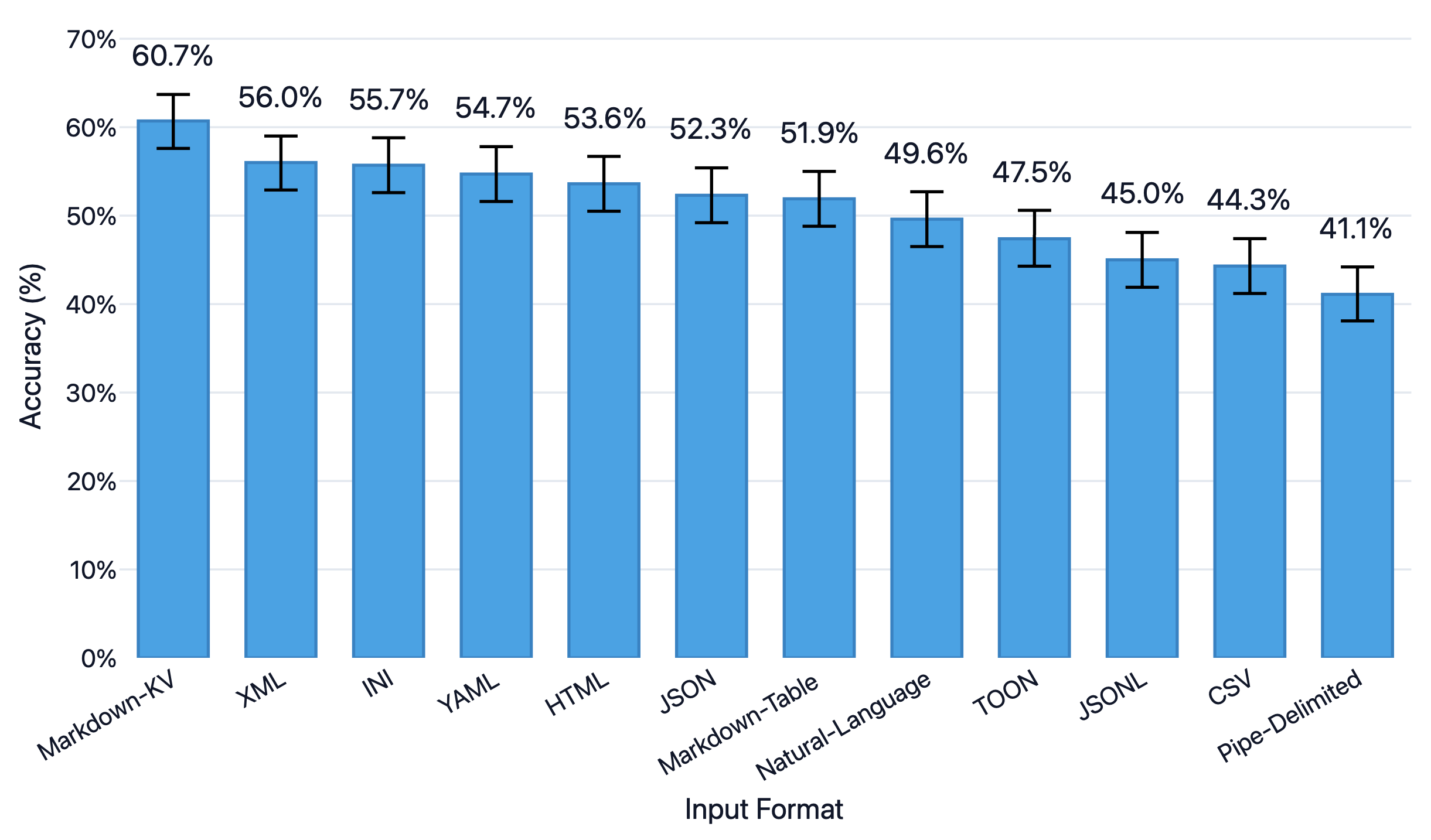 The same researchers point out another caveat. For deeply nested data (6-7 levels of nesting), markdown comes out second best to YAML. However, for most OCR tasks, document data isn't really that deeply nested, and markdown will work just fine.