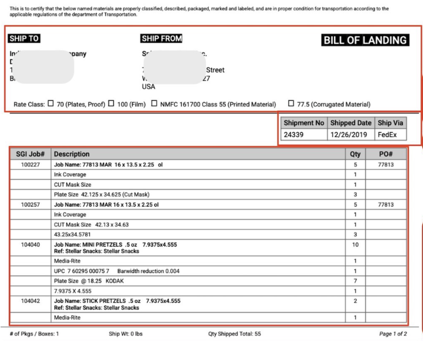 Rate Class: ☐ 70 (Plates, Proof) ☐ 100 (Film) ☐ NMFC 161700 Class 55 (Printed Material) ☐ 77.5 (Corrugated Material)