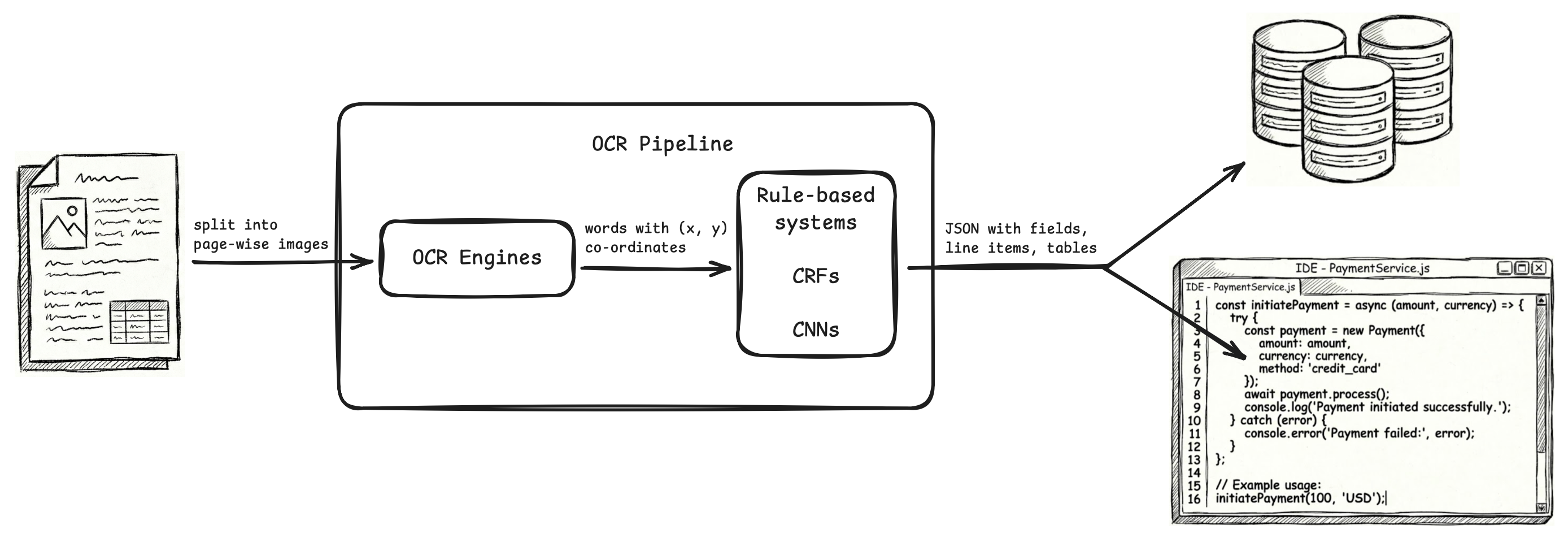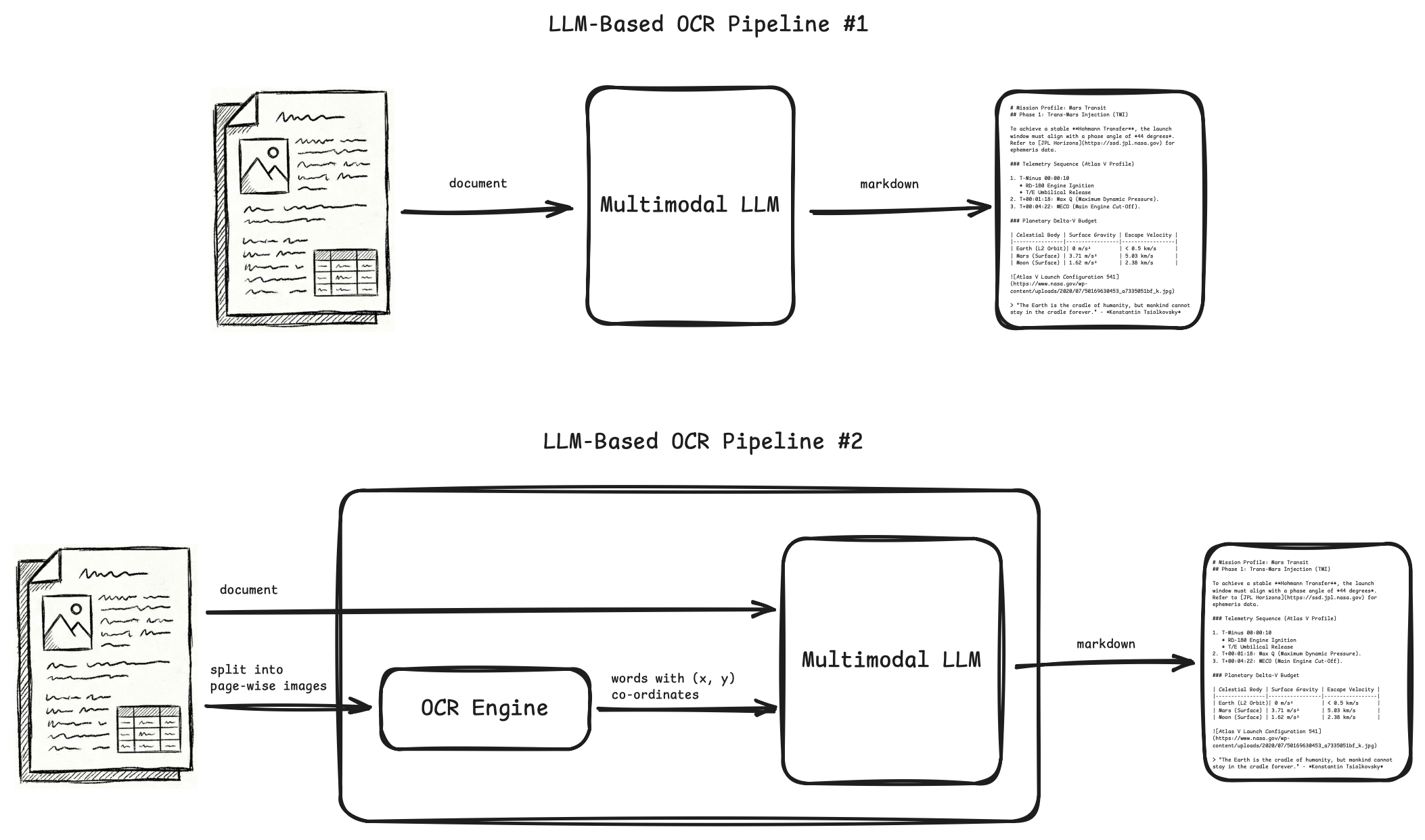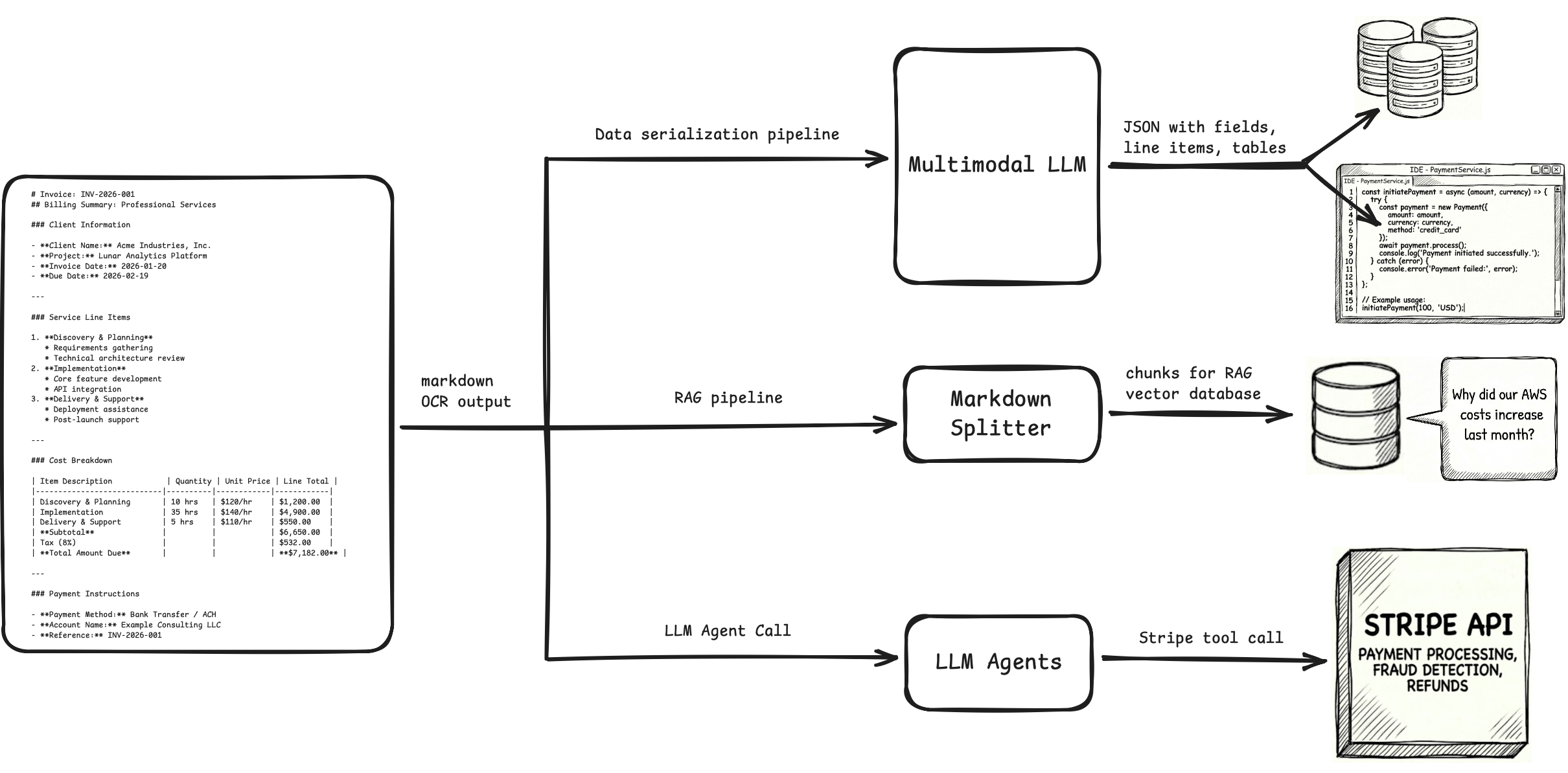 We'll use examples to build intuition for why this matters. Consider an invoice OCR pipeline. In theory, we can use a multimodal LLM to directly generate JSON from the invoice. How do we benefit from a two-step pipeline where we convert Document→Markdown→JSON?